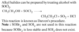 \(C_{2}H_{5}OH + SoCl_{2} \overset{pyridine}{\rightarrow} C_{2}H_{5}Cl + SO_{2} + HCl\)