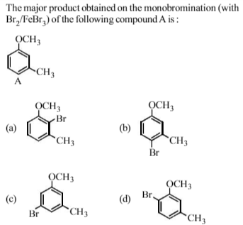 The reaction is an example of electrophilic aromatic substitution. Although both OCH3 and CH3 groups are o,p-directing, the OCH3 group dominates.Product(b) is favoured because the new coming group (Br)experiences least hindrance.