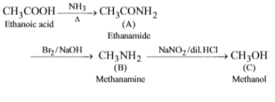 Ethanoic acid on heating with ammonia forms compound A which on treatment with bromine and sodium hydroxide gives compound B. Compound B on treatment with NaNO2/dil.HCl gives compound C. The compounds A, Band C respectively are