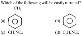 Of the given compounds toluene which contains an electron donating group in the ring will be nitrated easily.